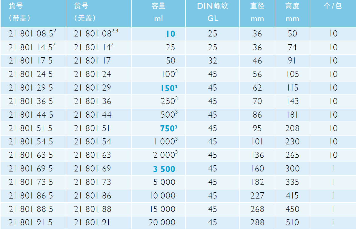 具有显著特性的 DURAN® 实验室玻璃瓶己赢得市场好评多年。经过不断发展和提高,DURAN GROUP 在原有产品的基础上推出了一系列设计精良的优质产品。为用户提供两种选择,一种是单独的瓶子,另一种是配有螺旋盖(PP 材质1)和倾倒环(PP 材质1),用倾倒环倾倒时不会产生滴漏,干净,安全。螺旋盖和倾倒环的工作温度极限为:+140°C